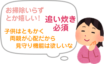 「自動お掃除」や「見守り機能」といった主婦に優しい機能や、「マイクロバブル」や「UV除菌」のような入浴を快適にする機能もありますので、予算の中で検討してみるのも良いかもしれません。
