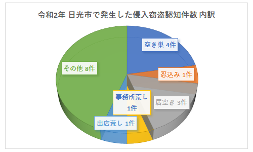 令和2年度に栃木県日光市で発生した窃盗被害は151件でした。また、住居や建物などを狙った侵入窃盗は18件、そのうち4件は住人の留守中を狙った空き巣被害です。(出典:栃木県警察調べ )