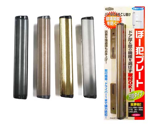 ドアと枠の隙間を補強する金属製のプレートで、バールなどによるこじ破りを防ぐためのグッズです。古い玄関ドアや、ラッチ周辺が弱い構造のドアに有効です。