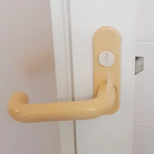 トイレ扉のレバーハンドルが下がったまま元に戻らず開けっぱなしの状態でトイレを使用しているので交換してほしい。..