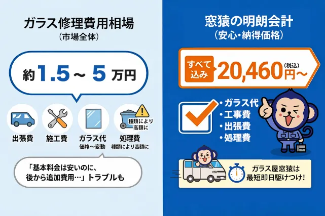 ガラス屋の窓猿ならガラス修理や交換の費用が全てコミコミ。ガラス代や工事費、出張料や割れたガラスの処分費など全てが含まれたわかりやすい料金で見積りをお出しします。