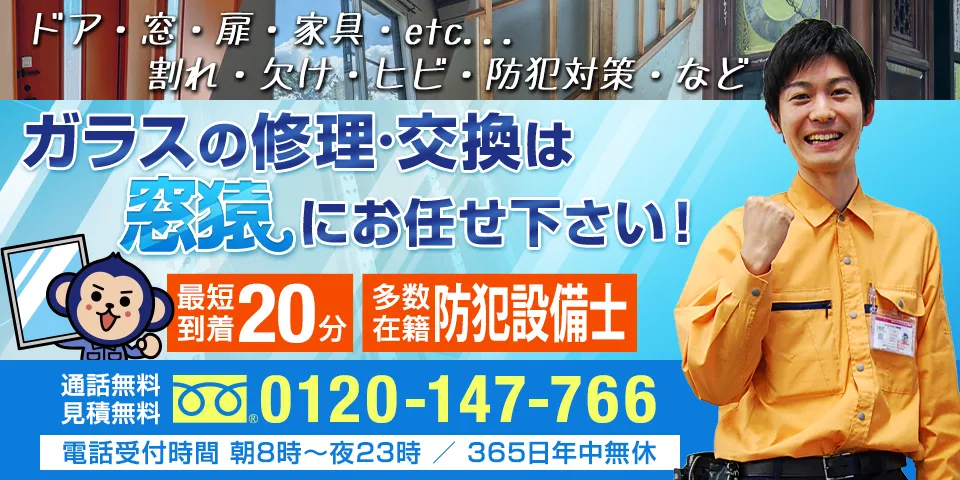 もし、窓ガラスの交換を検討していれば窓猿までご相談ください。窓猿でしたら年中無休で最短20分で現場に駆け付けます。窓ガラスのことで何かお困りのことがあれば窓猿までお気軽にお問い合わせください。